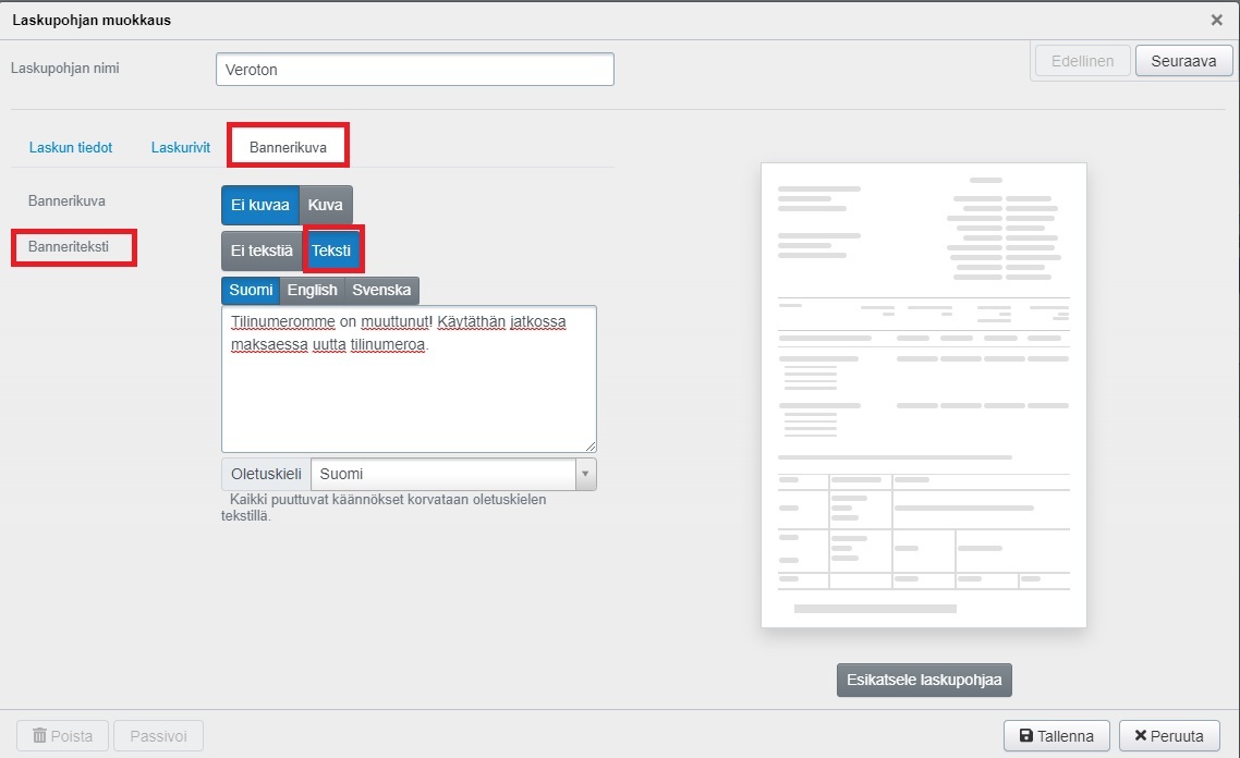 - Jos yrityksessäsi on käytössä useita laskupohjia, lisää banneriteksti kaikkiin.