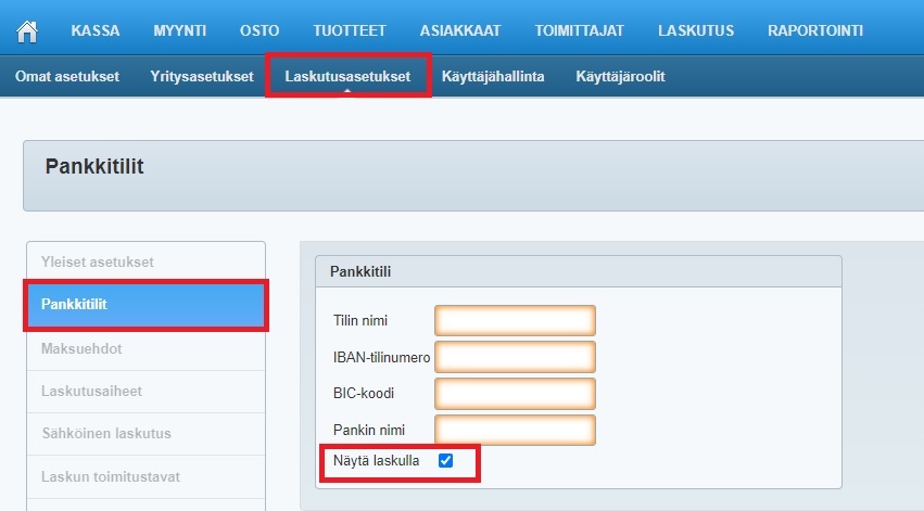 - Jos vanha tilinumero poistuu kokonaan, palaa vielä Laskutusasetusten Pankkitilit-välilehdelle, ota vanhan pankkitilin tiedot muokkaustilaan ja poista valinta kohdasta Näytä laskulla.
