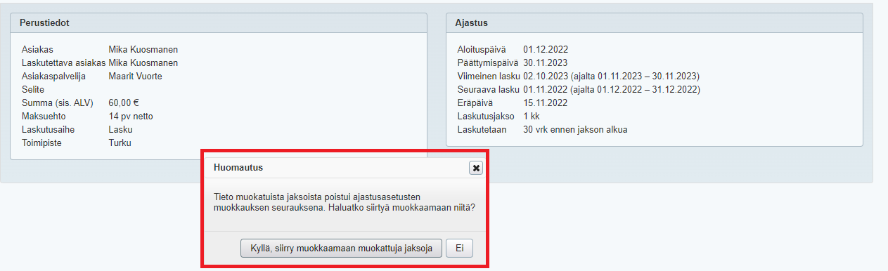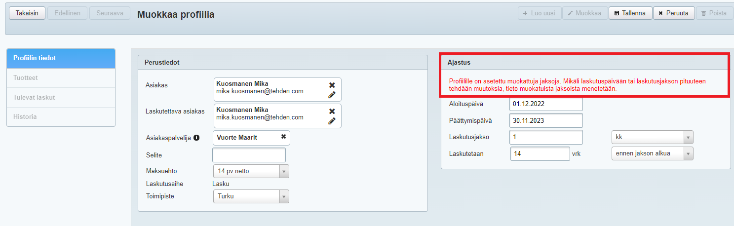 Jos haluat joka tapauksessa tehdä muutoksia laskutusprofiiliin ja tallennat muutokset, pääset siirtymään suoraan tulevien laskujen muokkaamiseen ja voit tarvittaessa palauttaa ensimmäiselle laskulle asiakkaan aloituspäivän mukaisen, normaalista laskutusjaksosta poikkeavan pituuden: