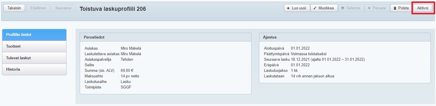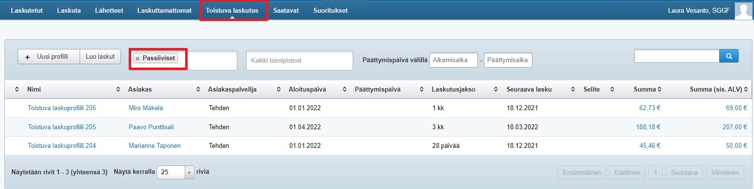 aktivoimaan myyntitilaukseen liittyvän laskutusprofiilin.- Suodata Toistuva laskutus -listausta siten, että näet Passiiviset laskutusprofiilit: