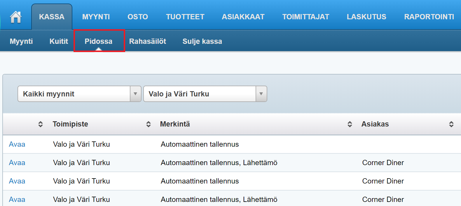 - Ota pidossa oleva myynti käsittelyyn klikkaamalla rivin vasemmassa laidassa olevaa Avaa-painiketta. Kun myynnistä on jo otettu maksuja vastaan ja se on jäänyt kesken, Avaa-tekstin vieressä on myös huutomerkki: