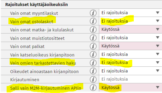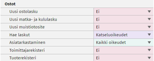 Varmista Procountorin käyttäjäoikeuksien hallinnassa, että integraatiossa käytettävällä tunnuksella on Procountorissa vähintään oheisen kuvan mukaiset oikeudet: