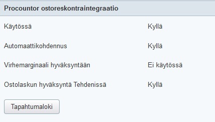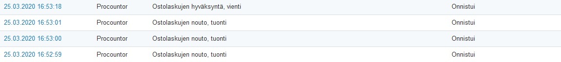 Tapahtumaloki löytyy sekä Yritysasetusten Kirjanpitopalvelut-välilehdeltä että Laskutusasetusten Ostoreskontra-välilehdeltä. Tapahtumalokissa voit tarkastella Tehdenin Procountor-integraation tekemiä tapahtumia liittyen ostoreskontraintegraatioon ja mahdolliseen kirjanpitointegraatioon: