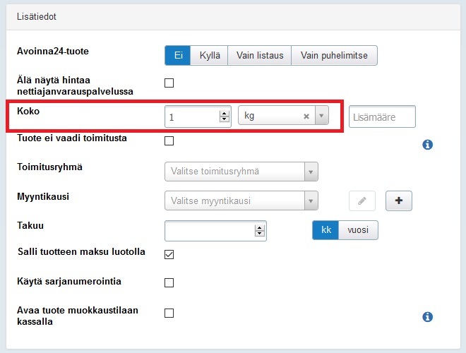 - Siirry sitten Lisätiedot-osioon. Jos tuotteella on kilohinta, lisää Koko-kenttään 1 ja valitse yksiköksi kg: