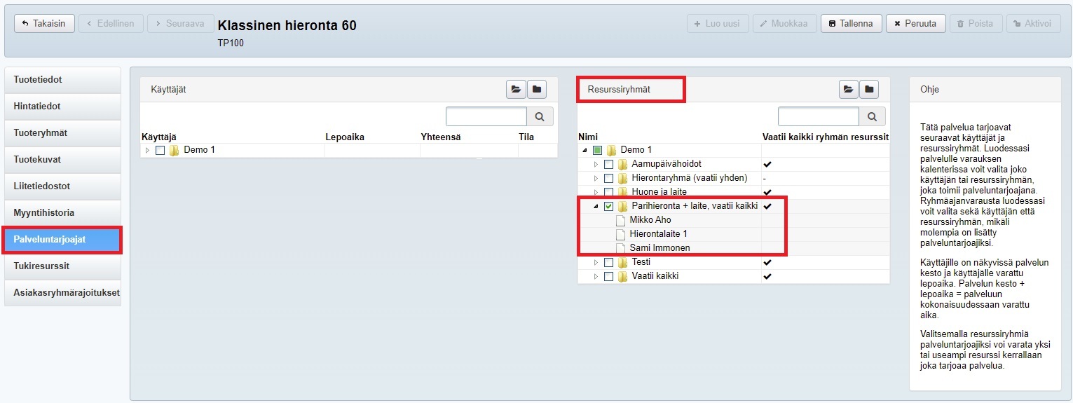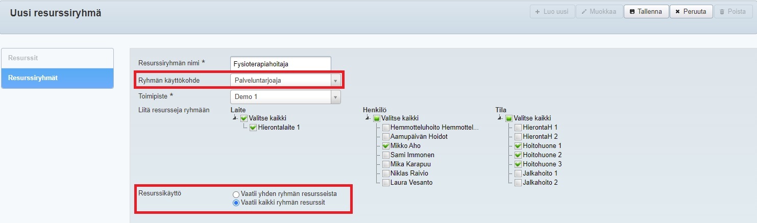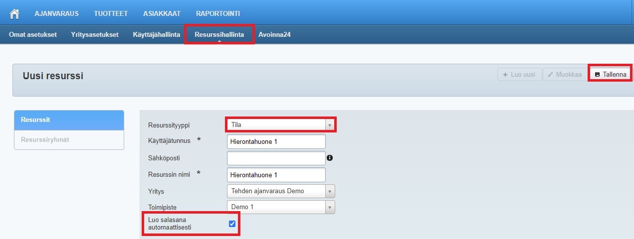 Jos resurssi on joko tila, laite ja henkilö, jota tarvitaan palvelun toteuttavan henkilön lisäksi, täytyy ensin luoda resurssi/resurssit ja sitten niistä resurssiryhmä. Jos palvelun toteuttamiseen tarvitaan vain resurssi (esim. asiakas varaa pelkän tilan), resurssia käytetään itsenäisenä. Huomioithan, että tukiresurssi-tyyppisestä resurssiryhmästä varataan palvelua varten vain yksi laite/tila/henkilö, eli jos resurssilla halutaan varata useita laitteita/tiloja ja/tai resursseja, täytyy resurssiryhmän tyypiksi valita Palveluntarjoaja.