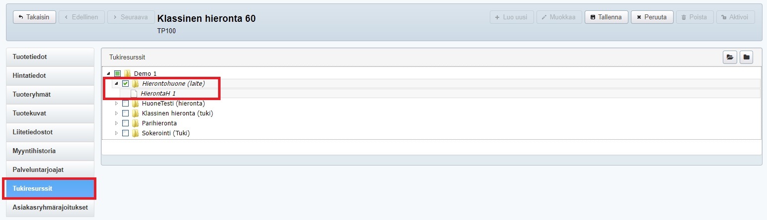 - Siirry nyt Tuotteet-ohjelmaan ja palveluun, jota resurssiryhmän huoneissa voi toteuttaa. Siirry palvelun Tukiresurssit-välilehdelle.