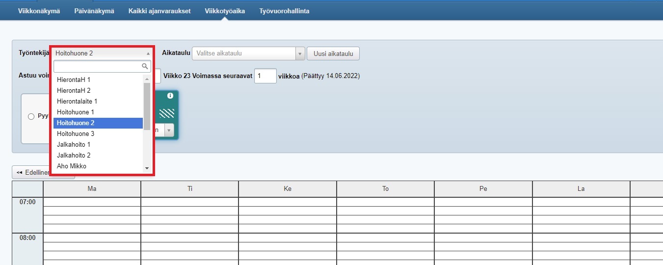 - Varmista myös Ajanvaraus-ohjelman Viikkotyöaika-sivulla, että halutulle palveluntarjoajalle on lisätty palveluaikaa haluttuihin kellonaikoihin.