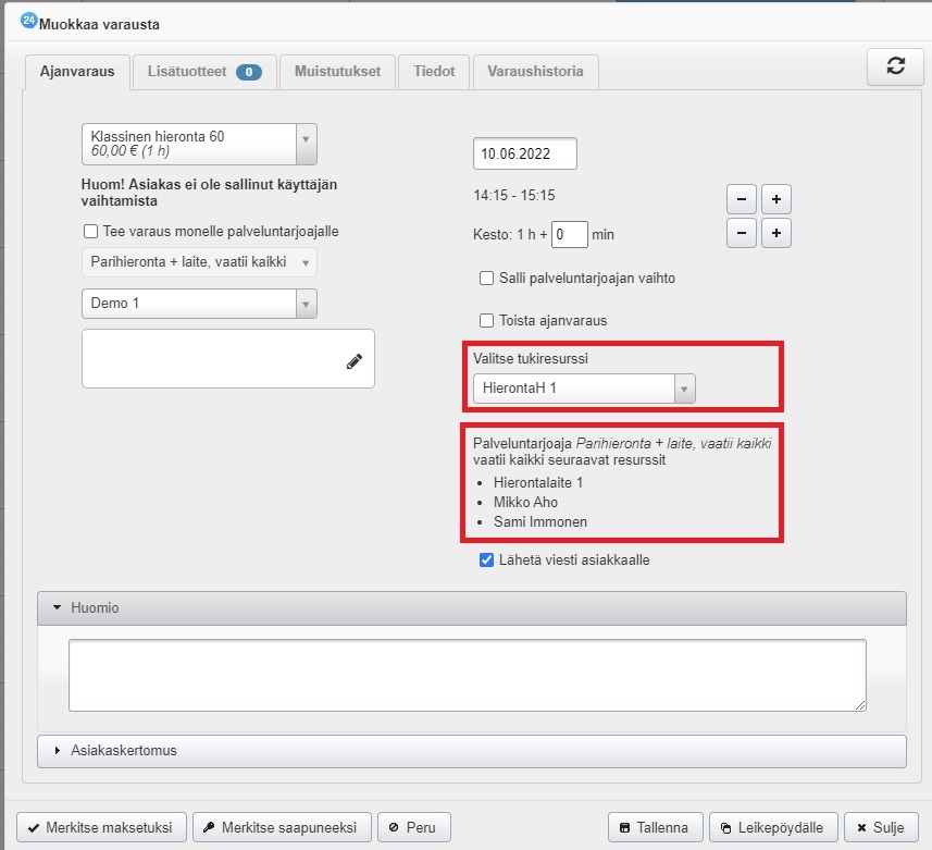 - Valitse edellä luomasi dummy-resurssi sekä Henkilö-kohdasta palvelun toteuttava työntekijä.