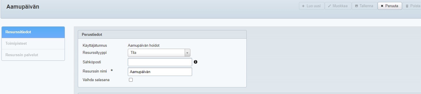 - Siirry Resurssinhallinta-ohjelmaan ja luo resurssi, jonka avulla rajaat palvelun saatavuutta. Jos palveluun tarvitaan tilaa, resurssi voi olla kyseinen tila, mutta voit myös luoda ns. dummy-resurssin, jota käytetään vain tähän tarkoitukseen: