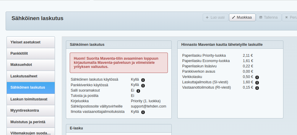 Huomioi, että jos Maventan päässä tehdään muutoksia käyttäjätunnukseen, jolla rajapinta on avattu, sähköinen laskutuskanava saattaa lakata toimimasta.