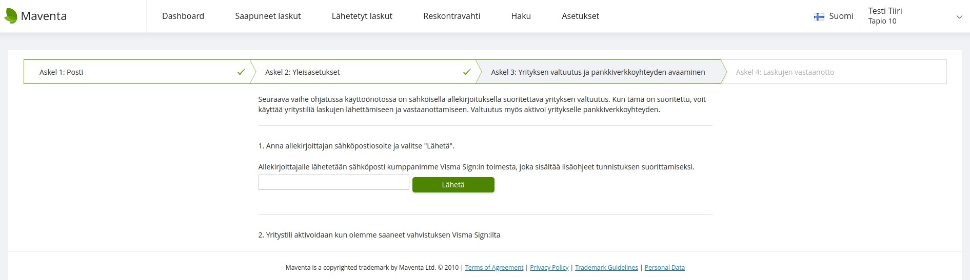 - Kun olet kirjautunut Maventa-tilille, näet alla olevan näkymän. Syötä siihen vaaditut tiedot, jolloin pääset vahvistamaan yrityksen ja pankkiverkkoyhteyden aktivoinnin sähköisellä allekirjoituksella Visma Sign -palvelussa. Tähänkin löydät tarkemmat ohjeet Maventan tukisivustolta.