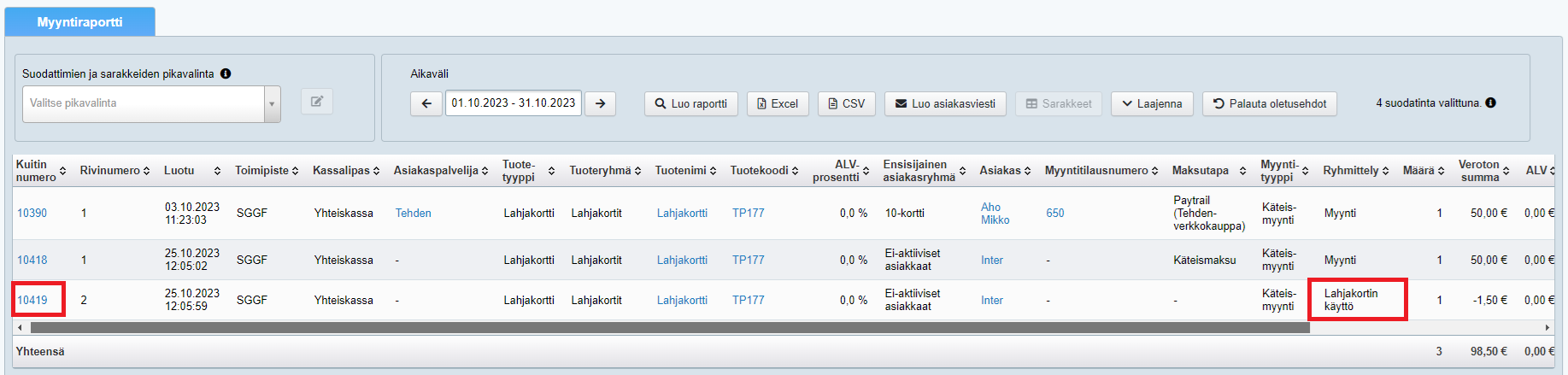 Myös sopimusyrittäjät käyttävät yrityksen yhteistä lahjakorttituotetta (jonka asiakas voi käyttää kaikkien yrityksen palveluntarjoajien palveluihin) ja myyvät lahjakortit pääyrityksen kassaan. Tällöin kun asiakas käyttää lahjakortin sopimusyrittäjän palveluihin, pääyritys on sopimusyrittäjälle velkaa sen summan, joka lahjakortilta käytettiin. Summan voi tarkistaa esim. myyntiraportilta. Varmista, että kohta Ryhmittele lahjakorttien ja tilimyyntien käyttö on valittuna raportin Yleisissä lisäehdoissa, kun luot raportin. Etsi sitten raportilta Lahjakortin käyttö -ryhmittely ja siirry kuitille tarkistamaan, mihin palveluun ja minkä arvoisen lahjakortin / osan lahjakortista asiakas on käyttänyt: