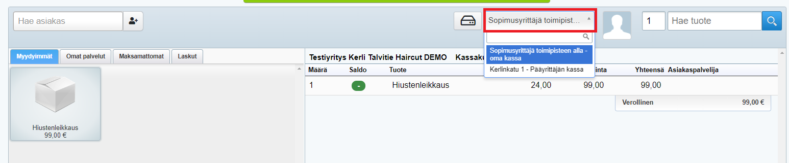 Kun sopimusyrittäjä myy palveluitaan, täytyy tämän muistaa kirjautua Tehdeniin omaan toimipisteeseensä, jotta myynnit kirjautuvat sopimusyrittäjän omaan kassaan. Jos kyseessä on sopimusyritys toimipisteen alla, myyntejä tehdessä valitaan oman sopimusyrityksen kassa: