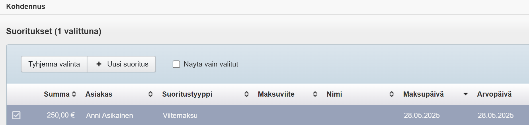 - Etsi Suoritukset-näkymästä suoritus, jonka haluat kohdentaa saatavaan.