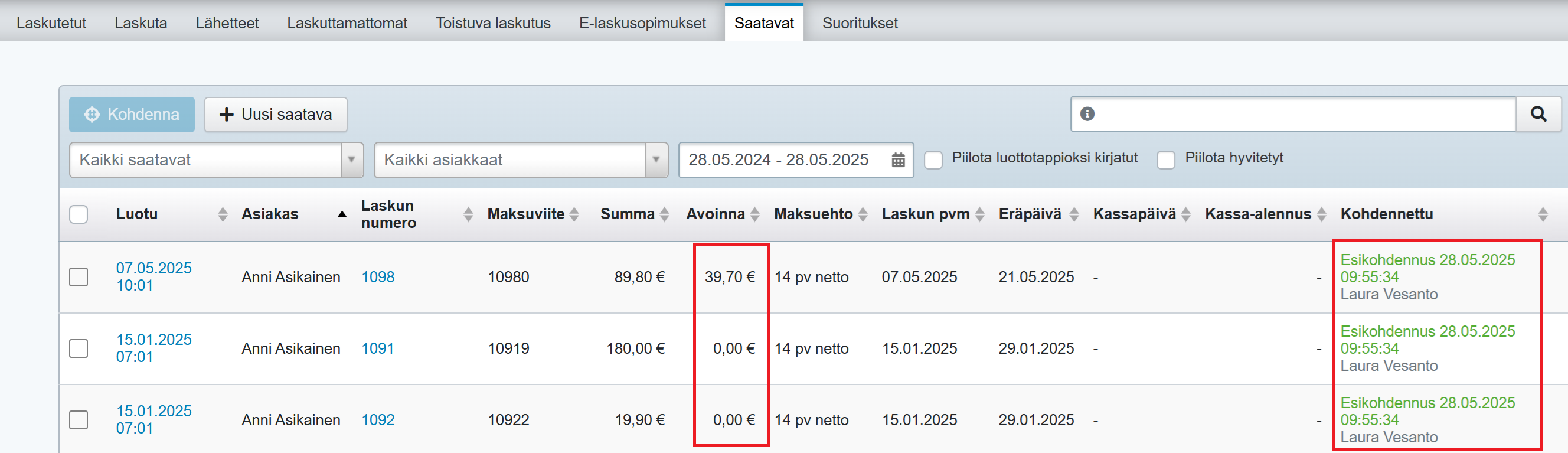 - Huomaa kuitenkin, että jos suoritus ei kata kaikkien valittujen laskujen summia (eli asiakkaalle jää vielä maksettavaa, ja suoritus on tulossa, eli erotusta ei ole tarkoitus kirjata luottotappioihin), laskut voidaan vain esikohdentaa, eli myös kokonaan maksetut laskut löytyvät Saatavat-näkymästä: