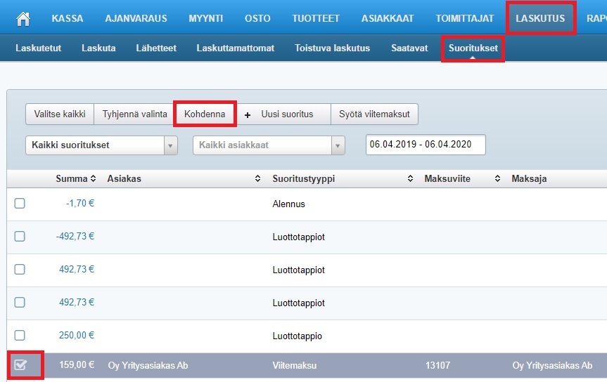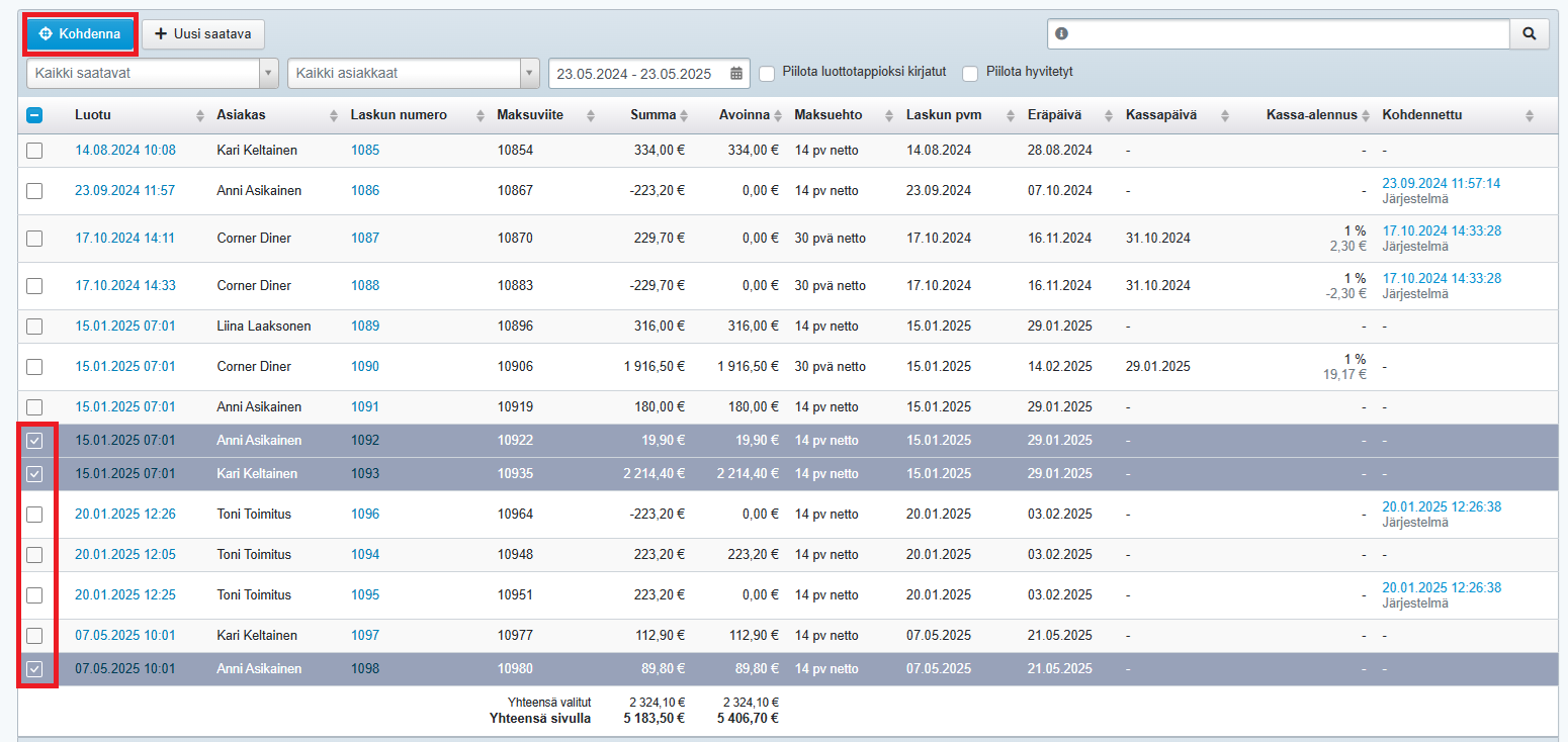 - Siirry Laskutus-ohjelman Saatavat-sivulle. Valitse laskut, joihin haluat kohdentaa asiakkaan suorituksen, ja paina Kohdenna: