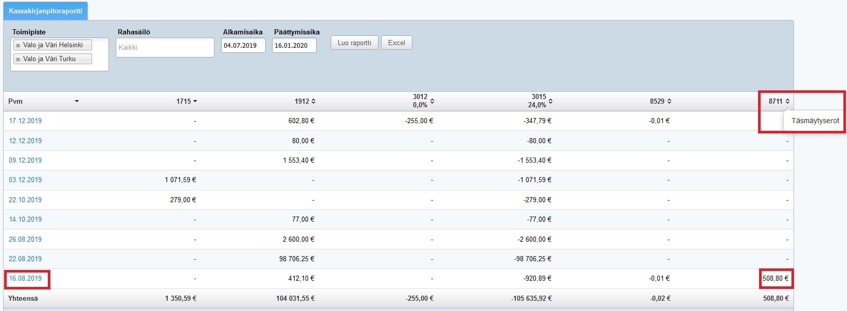 Kun kassakirjanpitoraportin Täsmäytyserot-tilillä on jonkin päivän kohdalla suuri summa, klikkaa rivin vasemmassa laidassa olevaa päivämäärää, jolloin pääset tarkastelemaan tarkemmin päivän tapahtumia: