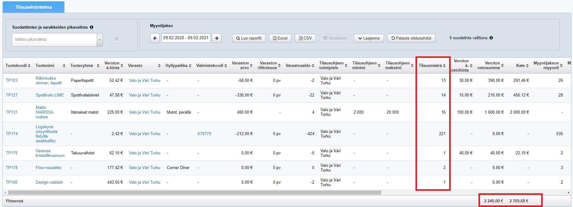 Täydennysehdotusraportti kertoo tilattavat määrät kullekin tuotteelle sekä laskee tulevan tilauksen kokonaissumman aikaisempien sisäänostohintojen perusteella.