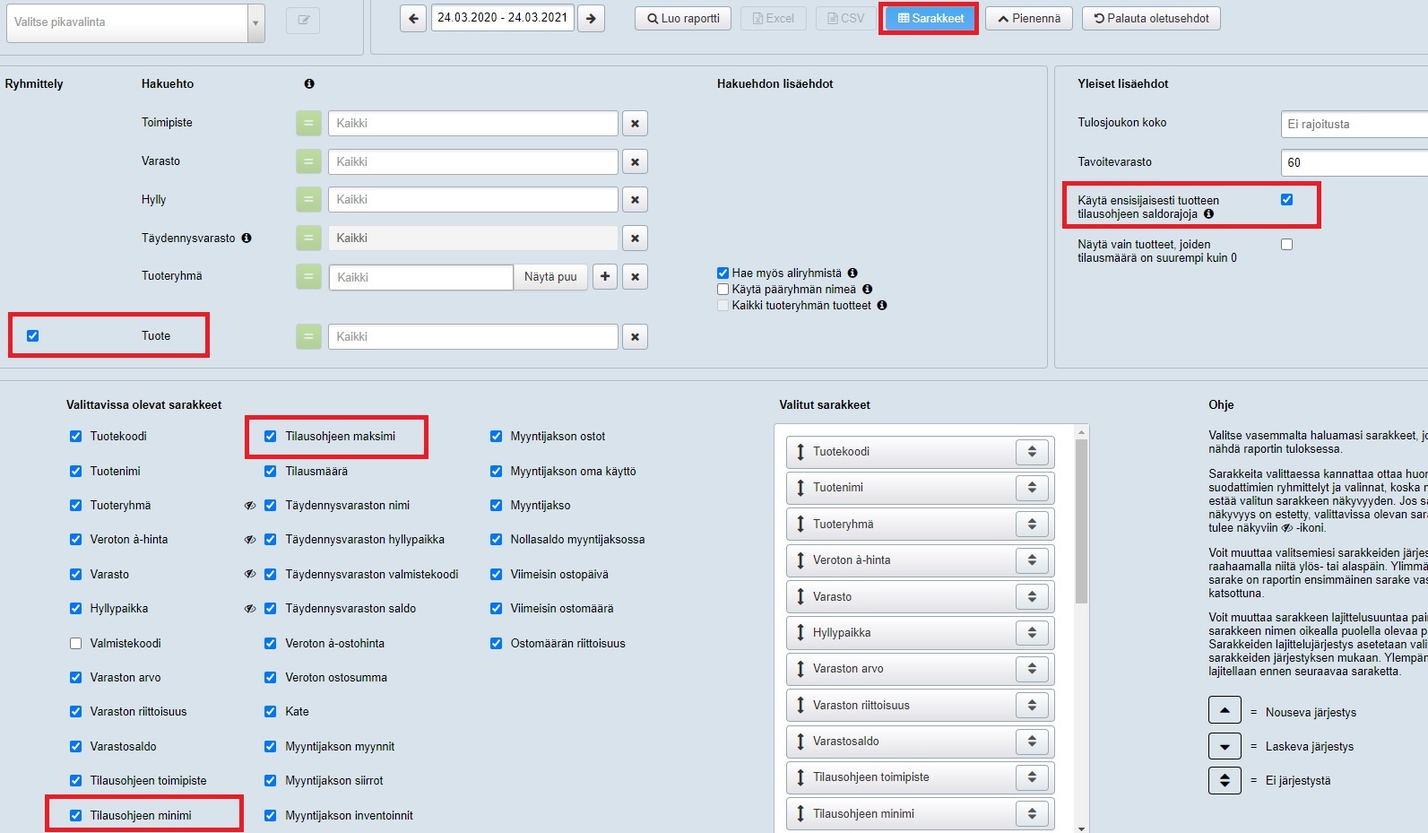 - Klikkaa ylälaidan Sarakkeet-painiketta ja varmista, että raportilla näytetään Tilausohjeen minimi- ja Tilausohjeen maksimi -sarakkeet. Voit samalla poistaa raportilta tarpeettomia sarakkeita ja/tai järjestellä niitä uudelleen.