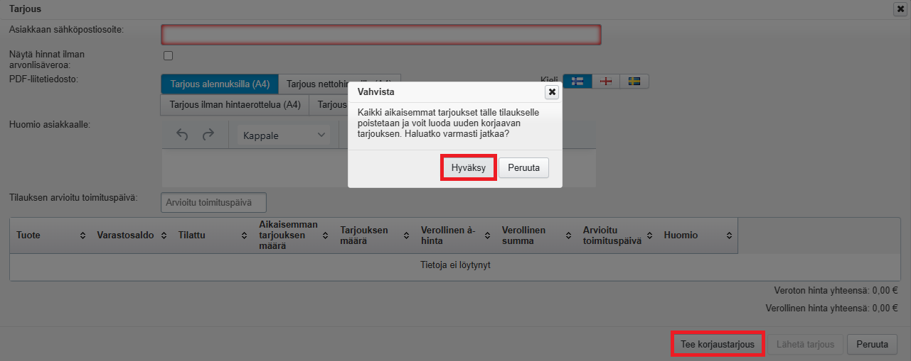 - Avautuvassa ikkunassa ilmoitetaan, että kaikki aiemmat tilaukselle luodut tarjoukset poistetaan, jonka jälkeen voit luoda korvaavan tarjouksen. Hyväksy-painikkeen painaminen ei vielä lähetä uutta tarjousta asiakkaalle, vaan poistaa vanhan tarjouksen: