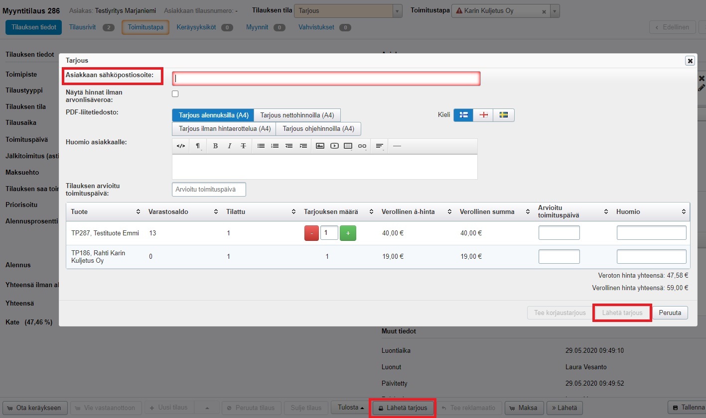 - Kun uusi tarjous on lähetetty, tallenna vielä tilaus, niin hinnat päivittyvät myös tilauksen tilausriveille.
