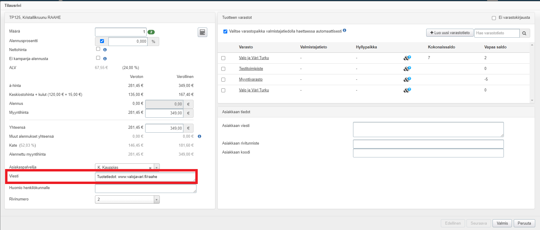 - Jos haluat lisätä tarjoukselle tuoterivikohtaisia lisätietoja, ne voi lisätä Viesti-kenttään. Kentän tietoja voi muokata myös myöhemmin, tarjouksen lähetysvaiheessa (Huomio-kenttä). Voit lisätä myös verkkosivun osoitteen, jonka kautta asiakkaasi voi tarjous-pdf:n kautta siirtyä tuotteen lisätietoihin: