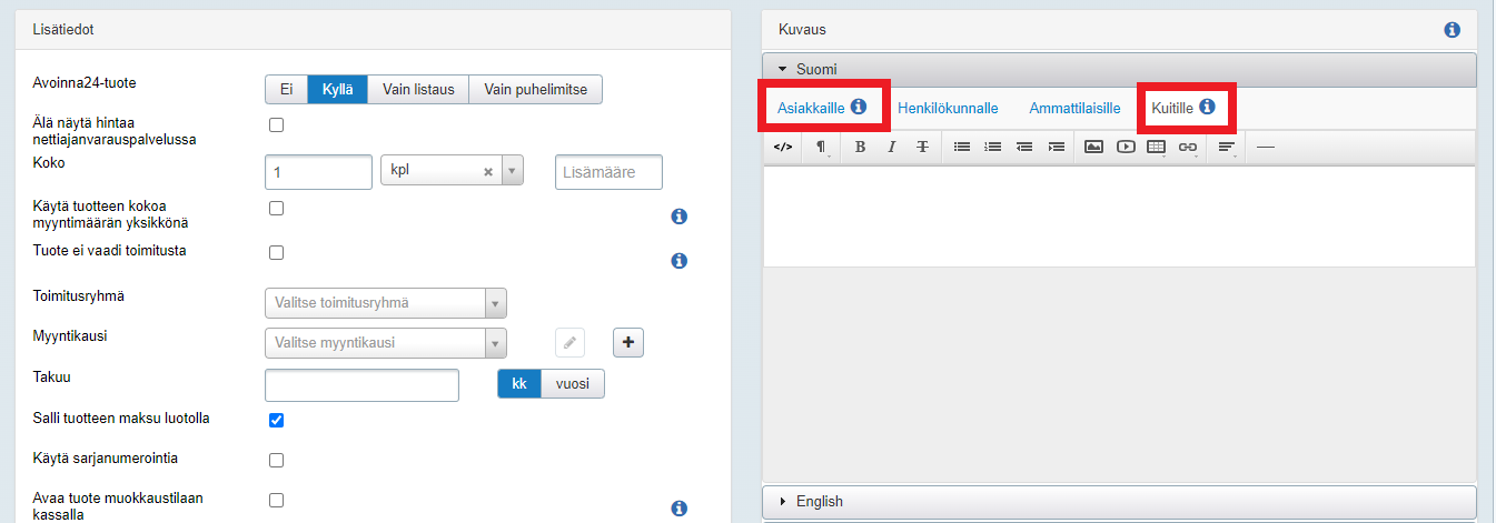 - Huom! Jos sama lisätieto halutaan lisätä tuotteelle jokaiselle tarjoukselle JA myyntitilaukselle, voi tiedon lisätä myös tuotteen tietoihin, Kuvaus-osion Asiakkaalle- tai Kuitille-kohtaan. Huom! Jos lisäämäsi lisätieto on verkko-osoite, älä luo linkkiä esim. yksittäisestä sanasta vaan liitä koko verkko-osoite näkyviin tekstikenttään.