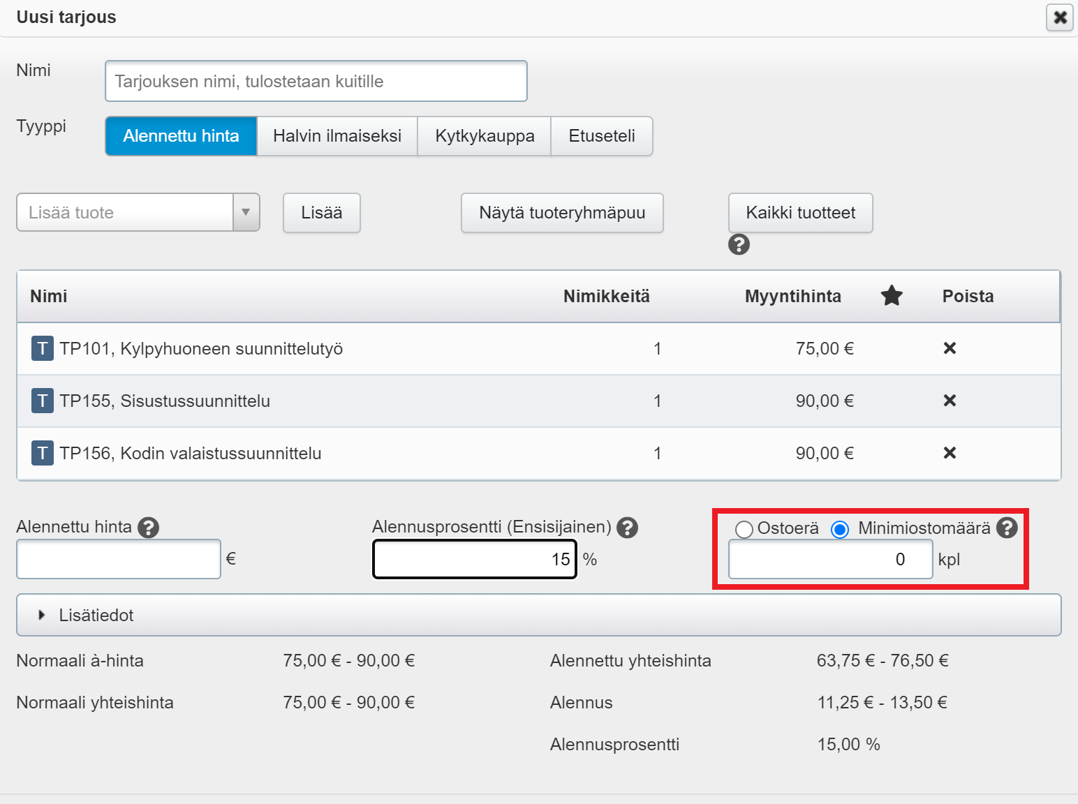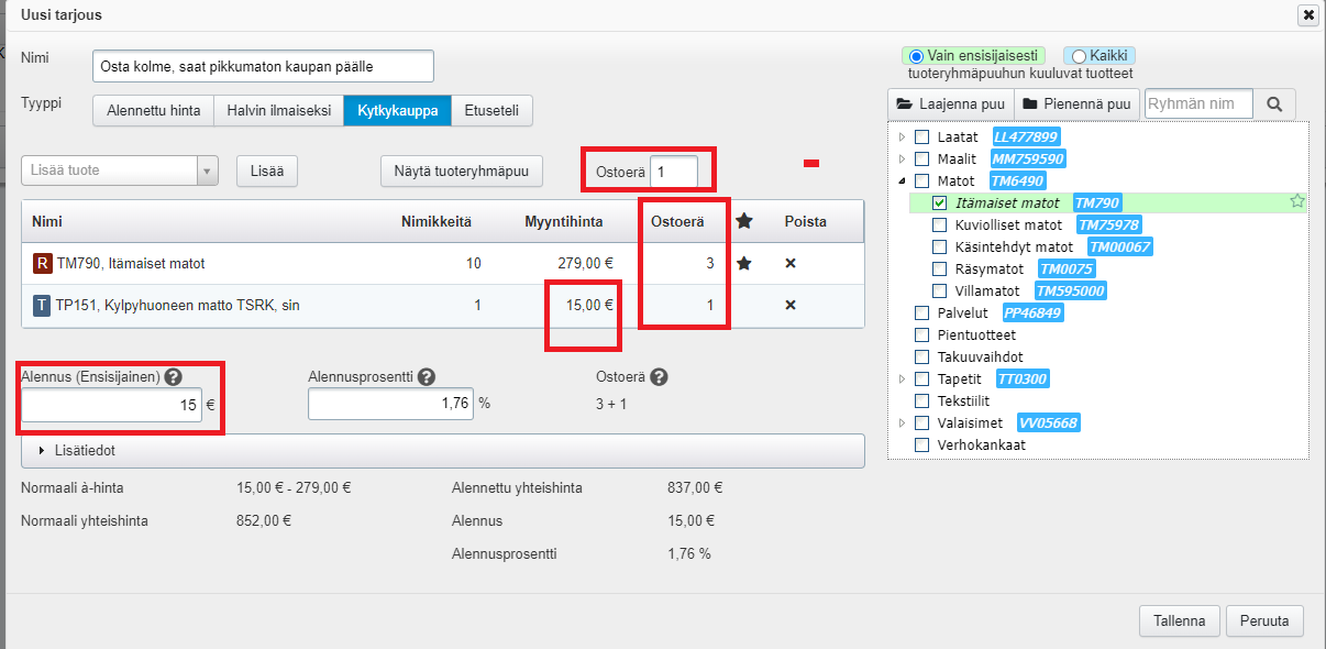 Tarjoukseen voi tietysti lisätä myös yksittäisiä tuotteita. - Huomioi, että jos asiakas ostaa määriteltyä ostoerää suuremman määrän kampanjaan kuuluvia tuotteita (esim. neljä tuotetta, kun tarjouksen saadakseen on ostettava kolme tuotetta), Tehden laskee alennuksen asiakkaan hyväksi siten, että asiakas saa saman alennuksen ostaessaan kaikki tuotteet kerralla kuin saisi ostaessaan tarjoukseen oikeuttavan määrän kerralla ja loput erikseen.