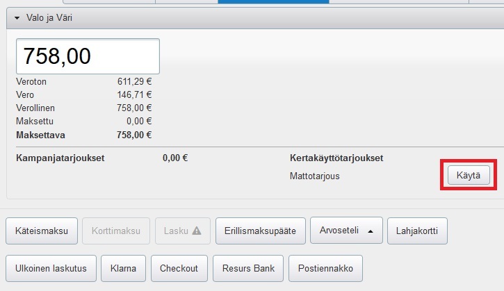 - Jos kampanja on avoin kaikille asiakkaille, kertakäyttöinen tarjous vaatii kuponkikoodien syöttämisen, ja jokaisella asiakkaalla pitää olla oma koodi. Valitse, millaista numerosarjaa haluat käyttää koodina ja syötä Kuponkikoodi alkaa -kenttään numerosarja, josta numerosarja alkaa (esim. 1234). Kuponkikoodi päättyy -kenttään syötetään toinen, selkeästi suurempi numerosarja (esim. 5000). Voit esim. luoda itsellesi erillisen tiedoston, jossa seuraat asiakkaille antamiasi numerosarjoja. Kun asiakas ostaa alennukseen oikeuttavan määrän tuotteita, klikkaa kassalla Käytä-painiketta ja lisää asiakkaan numerosarja, niin tämä saa loppusummasta tarjouksesi mukaisen alennuksen: