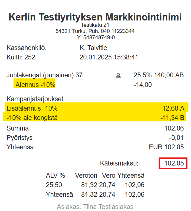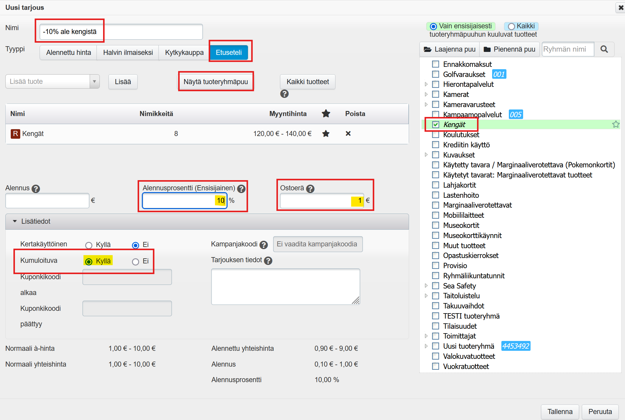 Jos yrityksessäsi on esim. kaikille asiakkaille suunnattu -10 % -alennus, jonka päälle halutaan kanta-asiakkaille tarjota vielä 10 %:n lisäalennus tietystä tuoteryhmästä, täytyy lisäalennus toteuttaa Etuseteli-kampanjalla. Kanta-asiakas saa lisäalennuksen vain, jos ostoksen hinta -10 %:n alennuksella ylittää Ostoerä-kenttään määritetyn summan, eli muista määrittää Ostoerä-kenttään riittävän pieni summa (esim. 1 €):