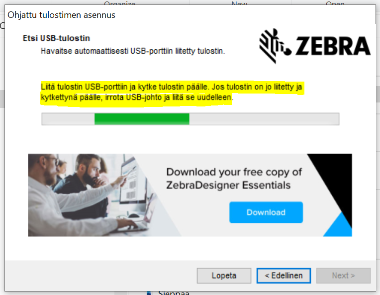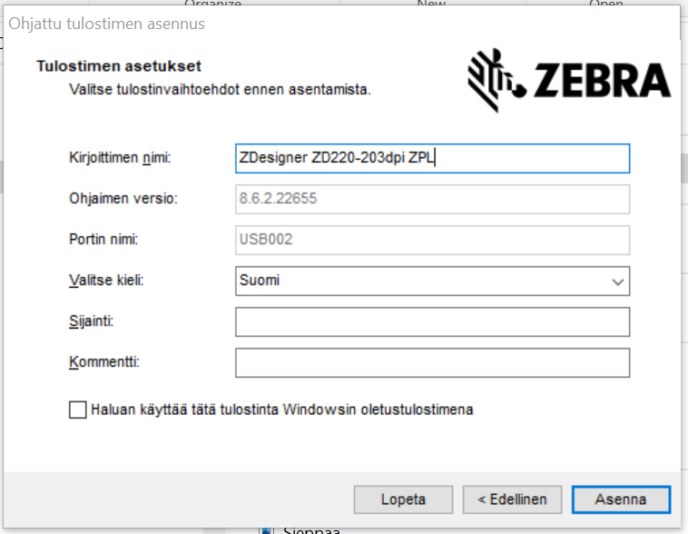 Tarratulostimen Zebra ZD220D/T asennus (Windows)