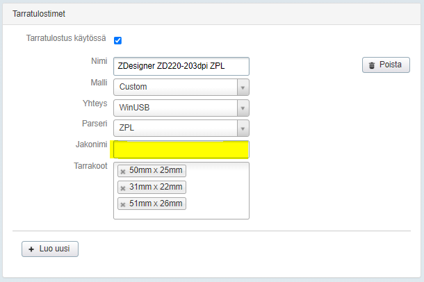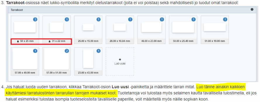 Tarrakoot täytyy ensin luoda ja sen jälkeen voitte valita tulostimella käytettävät tarrakoot listaan. Uusia tarrakokoja voitte määrittää seuraavien ohjeiden avulla: Tuotetarrojen tulostaminen, ohjeesta tarkemmin kohta kuvankaappauksessa: