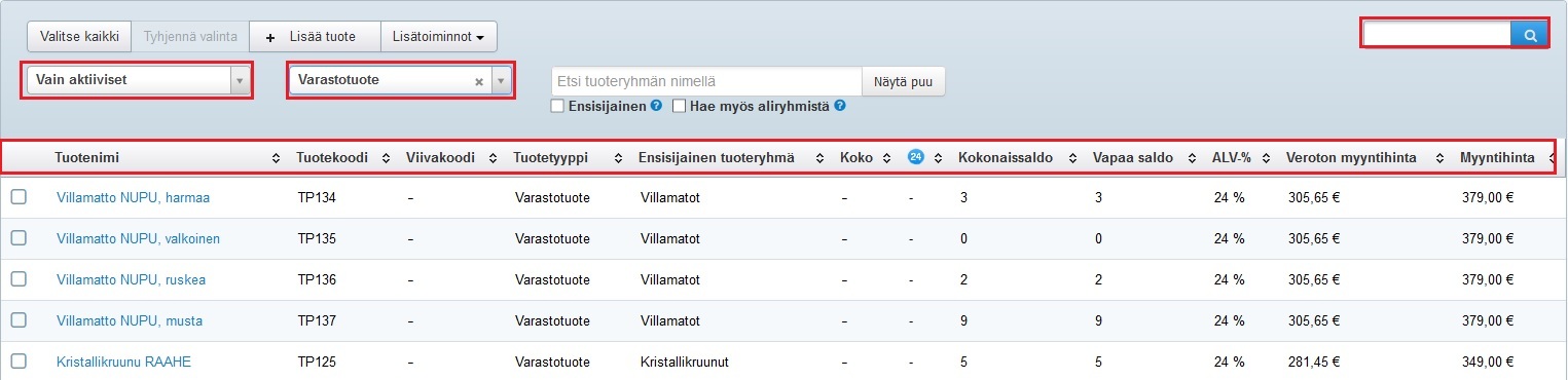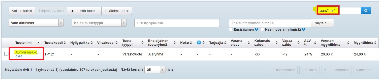 Jos taas tuotevalikoimassasi on useita samalla tuotemerkin nimellä alkavia tuotteita, voit rajata hakua lisäämällä alun yhtäsuuruusmerkin lisäksi tuotenimen jonkin toisen osan *asteriskien väliin*. Aurora-mekko löytyy nopeasti tuotehausta esimerkiksi =auro*me* -hakusanalla: