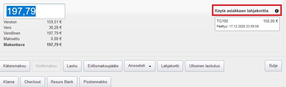 - Jos lahjakortilla on saaja, hyväksy järjestelmän ehdottama asiakkaan tiedoista löytyvä lahjakortti maksutavaksi: