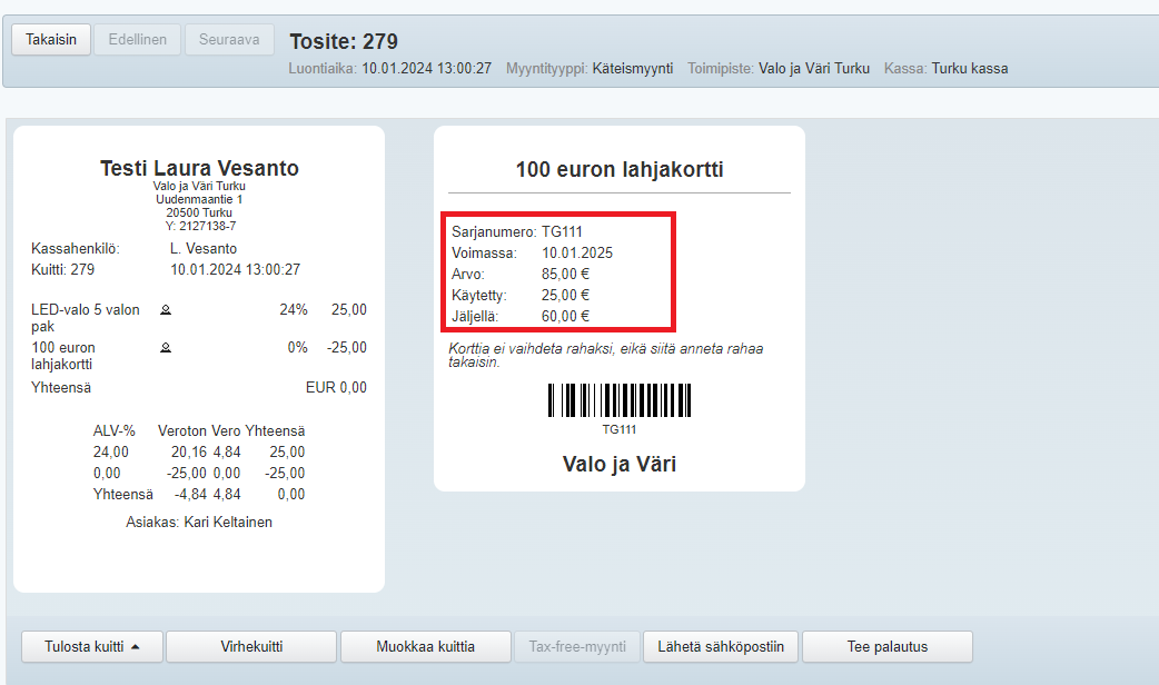 - Koko lahjakorttia ei ole pakko käyttää kerralla, vaan jos lahjakortille jää rahaa, myynnistä tulostuu uusi lahjakortti, jossa näkyvät alkuperäinen ja jäljellä oleva summa. Huom! Uuden lahjakortin tiedot päivittyvät kyseisen lahjakortin tietoihin kaikkialle Tehdeniin, eli myös aiempien sellaisten myyntien tietoihin, joissa tätä lahjakorttia on käytetty: