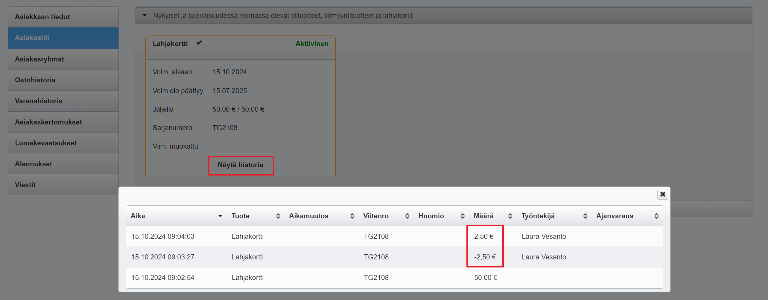 Lahjakortille tehdyt palautukset näkyvät asiakkaan tiedoissa, Asiakastili-välilehdellä lahjakortin Näytä historia -painiketta napsauttamalla: