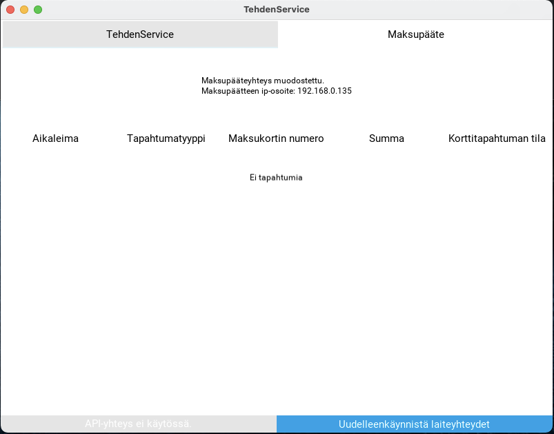 Ennen TehdenCardin poistamista, varmista maksupäätteen tila TehdenHubista. Jos "Maksupääte"-välilehti ei ole näkyvissä, aseta maksupääte TehdenHubiin ohjeen avulla.