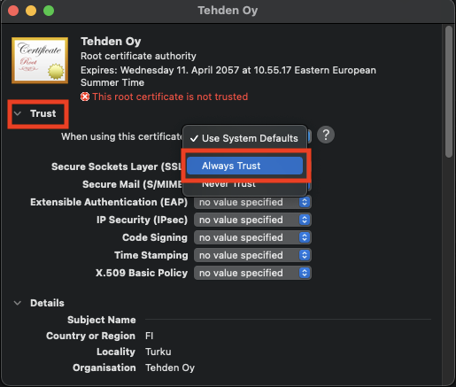 Laajenna valikko "luottamus" (trust) ja valitse ylimpään kohtaan "luota aina" (Always Trust).