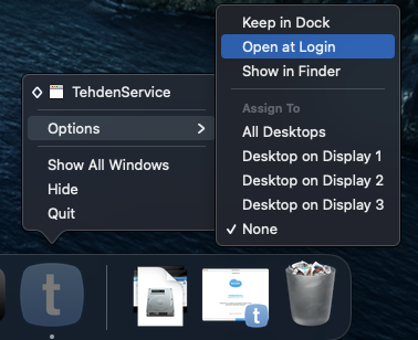 TehdenHubin saa käynnistymään automaattisesti tietokoneen käynnistyessä klikkaamalla alapalkissa näkyvää Tehdenin logoa hiiren oikealla painikkeella ja valitsemalla "Avaa kirjautuessa" (Open at Login).