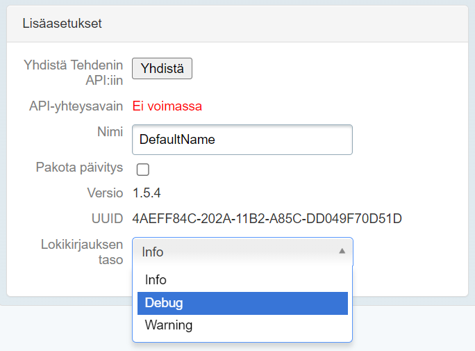 - Lisäasetukset-kohdasta löytyy Lokikirjauksen taso, jonka pudotusvalikosta valitaan Debug.