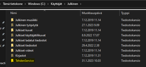 1. Poista vanha asennus polusta Tämä tietokone > Windows C: >Käyttäjät > Julkinen > Poista TehdenService kansio