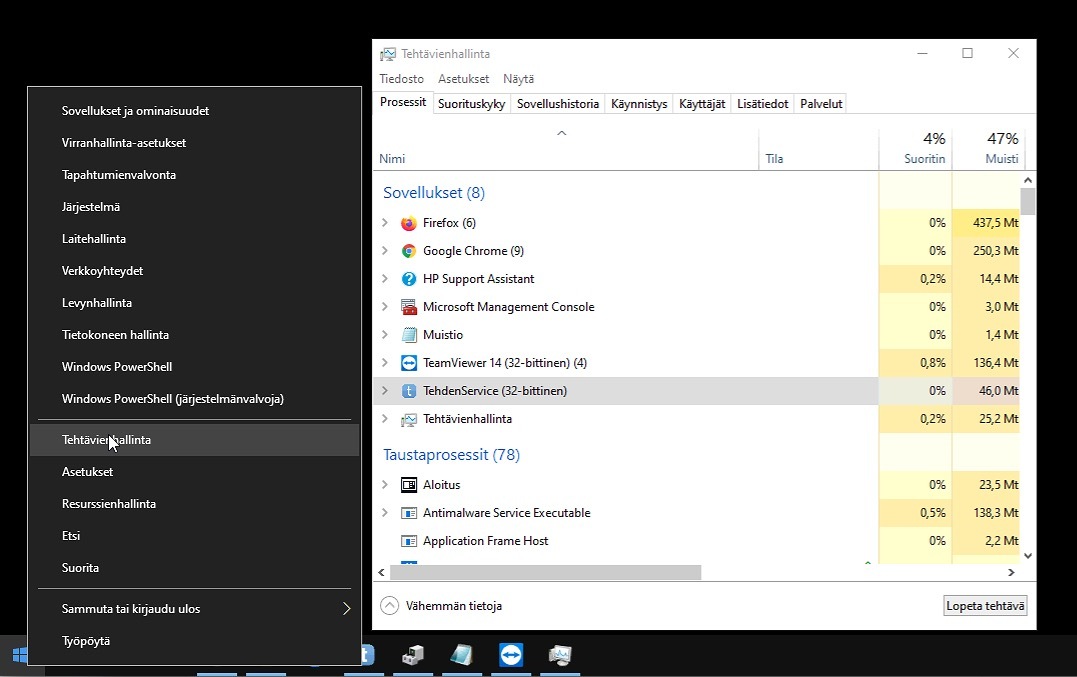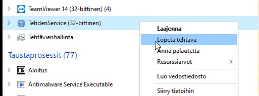 - Valitse ohjelmalistauksesta TehdenHub, klikkaa sitä hiiren oikealla painikkeella ja valitse Lopeta tehtävä: