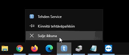 - Koeta ensin sulkea TehdenHub klikkaamalla hiiren oikealla painikkeella alapalkin kuvakkeesta ja valitsemalla Sulje ikkuna: