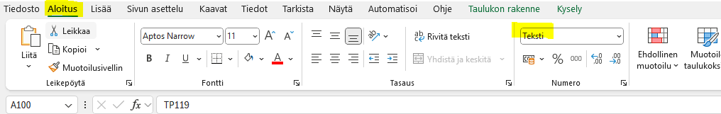 Tämän jälkeen kannattaa vielä vaihtaa kaikkien solujen tyypiksi "Teksti":