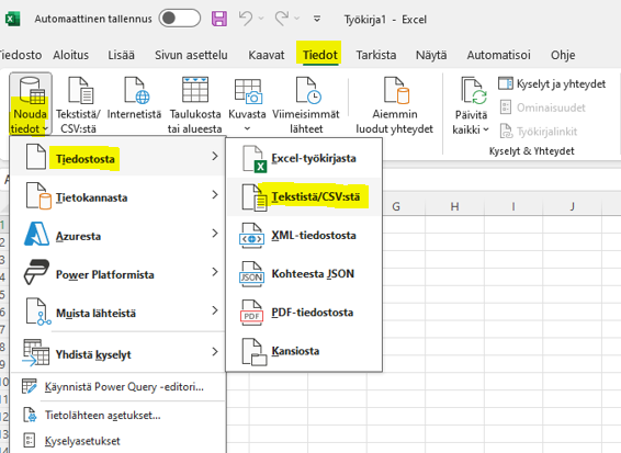 Ohjattu tuonti: Avaa MS Officen Excel-ohjelma, siirry Tiedot-välilehdelle ja valitse Noudat tiedot -> Tiedostosta -> Tekstistä tai csv:stä: