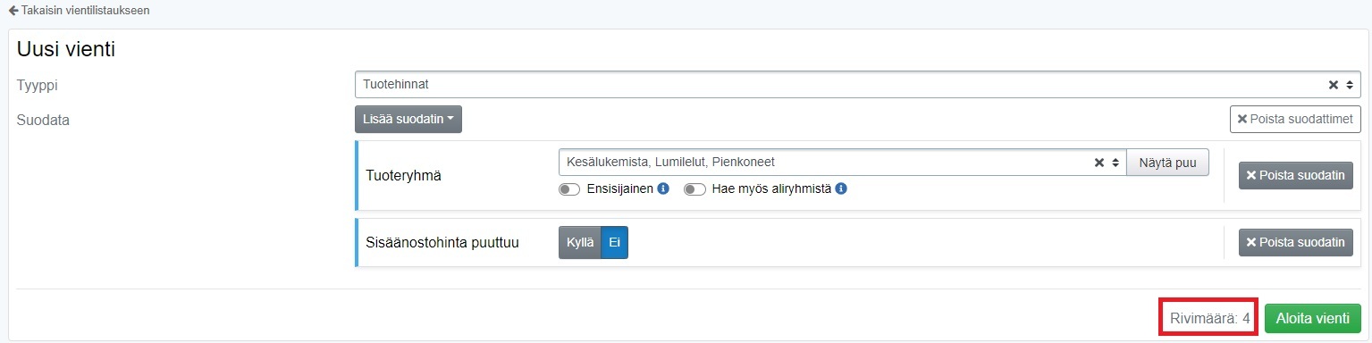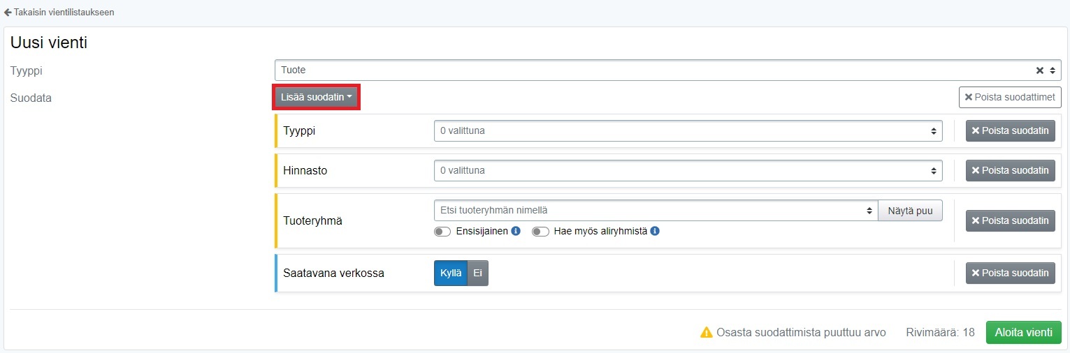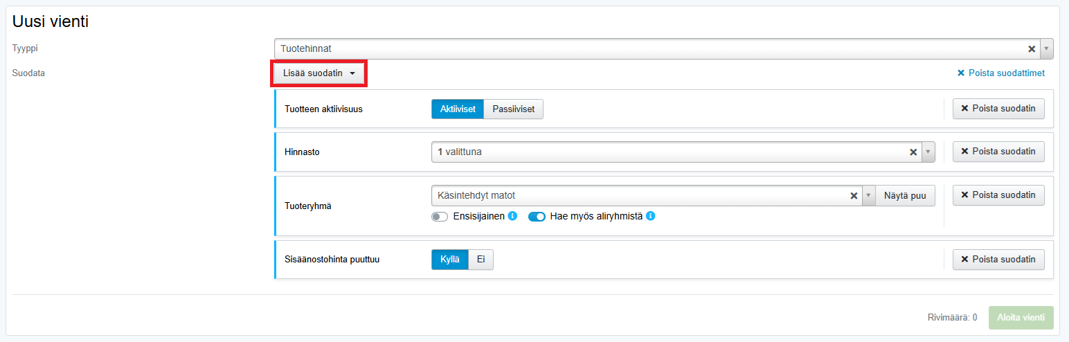 - Jos haluat tallentaa tuotteiden tai tuotehintojen tiedot, voi myös suodattaa tarkemmin, mitä tuotteita haluat tallentaa.
