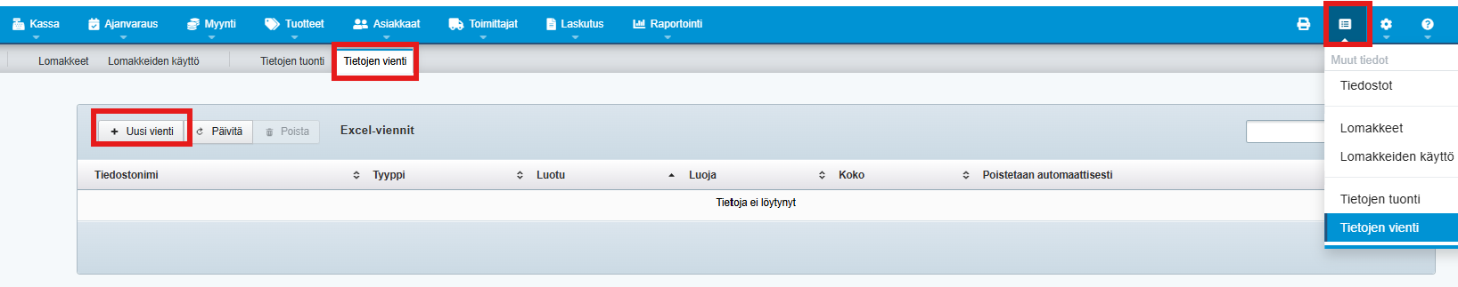 Kun yrityksesi Tehden-tilaukseen on lisätty maksuton tietotuontityökalu, löydät Tiedostot-kuvakkeen takaa myös Tietojen vienti -osion:
