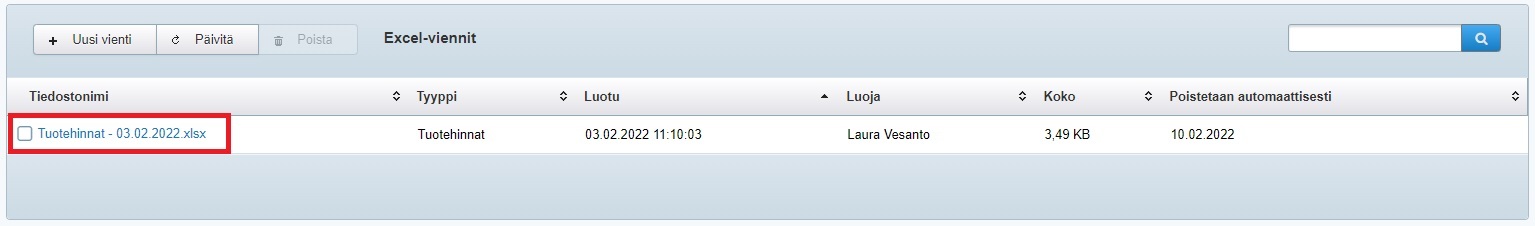 - Huomioi, että vaikka tuoteviennin suodatusperusteeksi valitsee hinnaston, Exceliin tuodaan tuotteiden julkiset hinnat, ei hinnastohintoja.