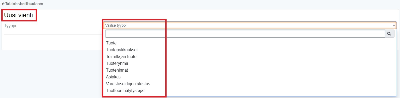 - Klikkaa Uusi vienti -painiketta. Siirryt uudelle sivulle, jossa voit Tyyppi-pudotusvalikosta valita, minkä ryhmän tiedot haluat tallentaa: