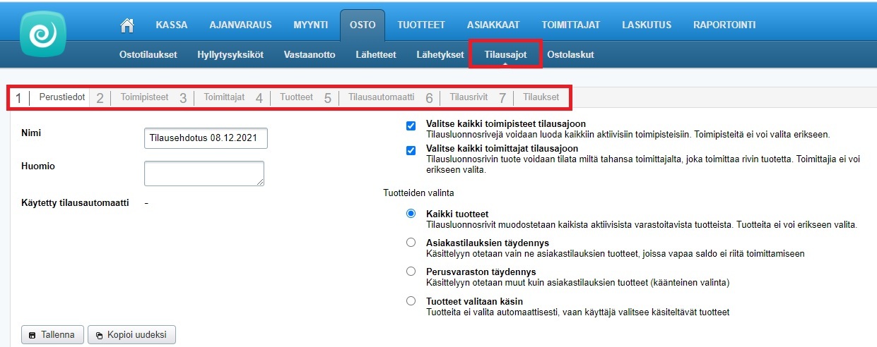 Tilausajon alussa täytetään perustiedot tuotteista, toimittajista ja toimipisteistä, joihin olemassa olevaa tilausajoautomaattia halutaan soveltaa tai joille halutaan luoda uusi tilausautomaatti. Sen jälkeen siirrytään luomaan itse tilausautomaatti eli säännöt, joiden perusteella valittuja tuotteita ehdotetaan tilattavaksi. Voit luoda useita tilausautomaatteja, esimerkiksi sesonkituotteille tai tuotteen kateprosentin mukaan.